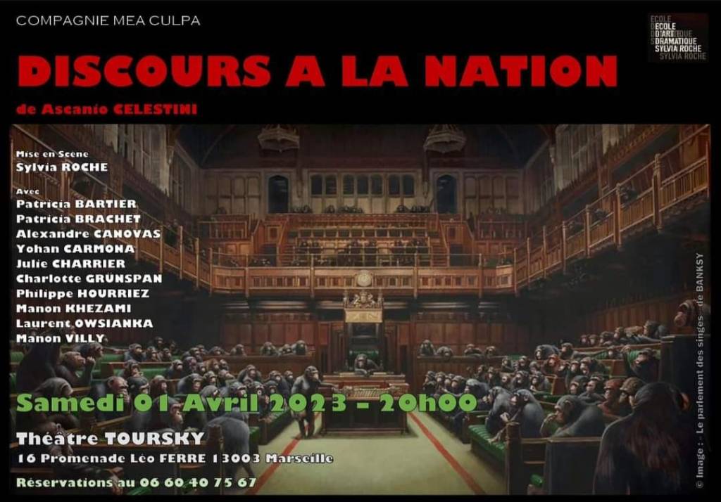 2023 Discours à la nation La compagnie MEA CULPA dirigée par Sylvia ROCHE présentera Discours à la nation le samedi 1er avril 2023 au Théâtre Toursky. Partager : Partager sur X(ouvre dans une nouvelle fenêtre) X Partager sur Facebook(ouvre dans une nouvelle fenêtre) Facebook J’aime chargement…